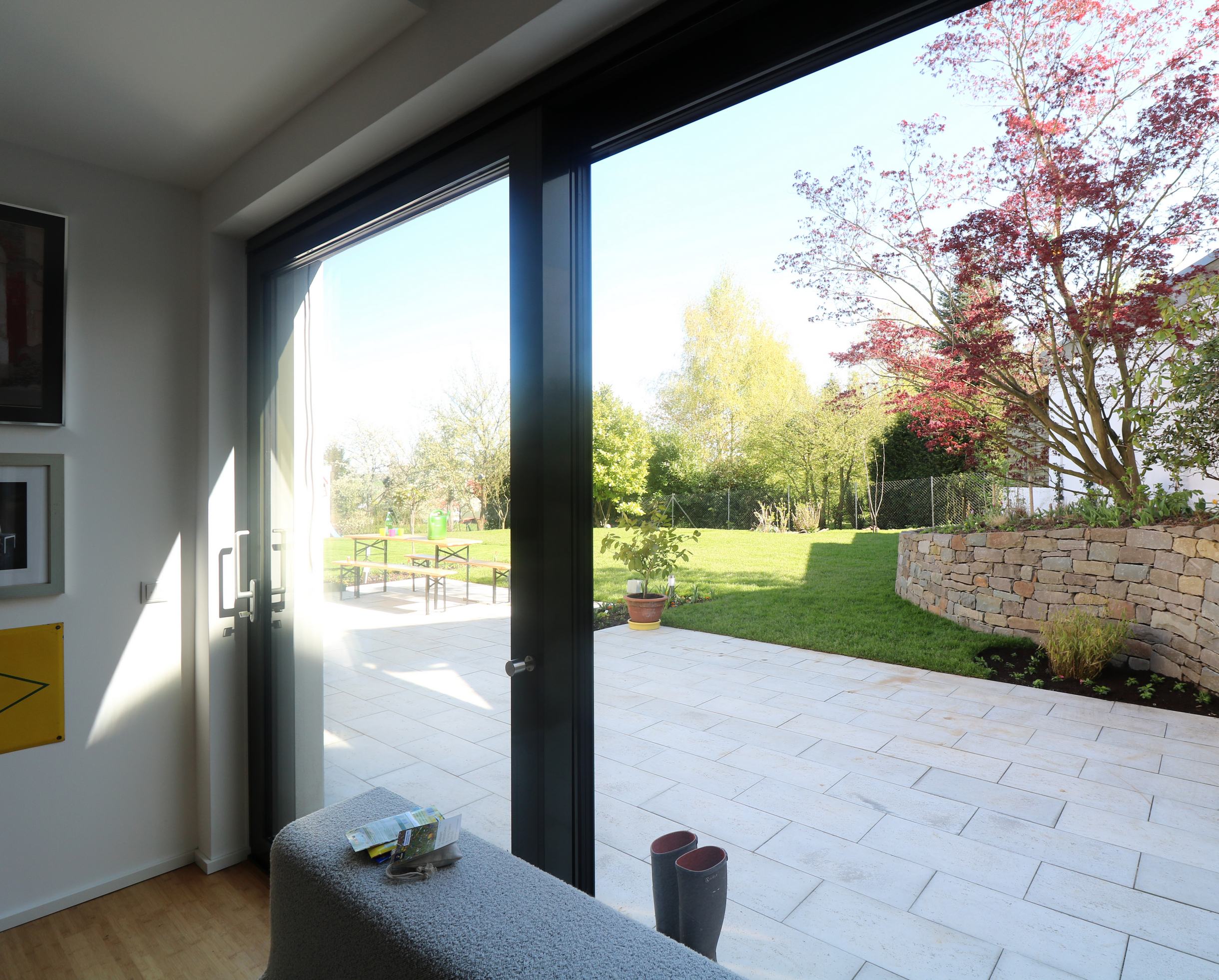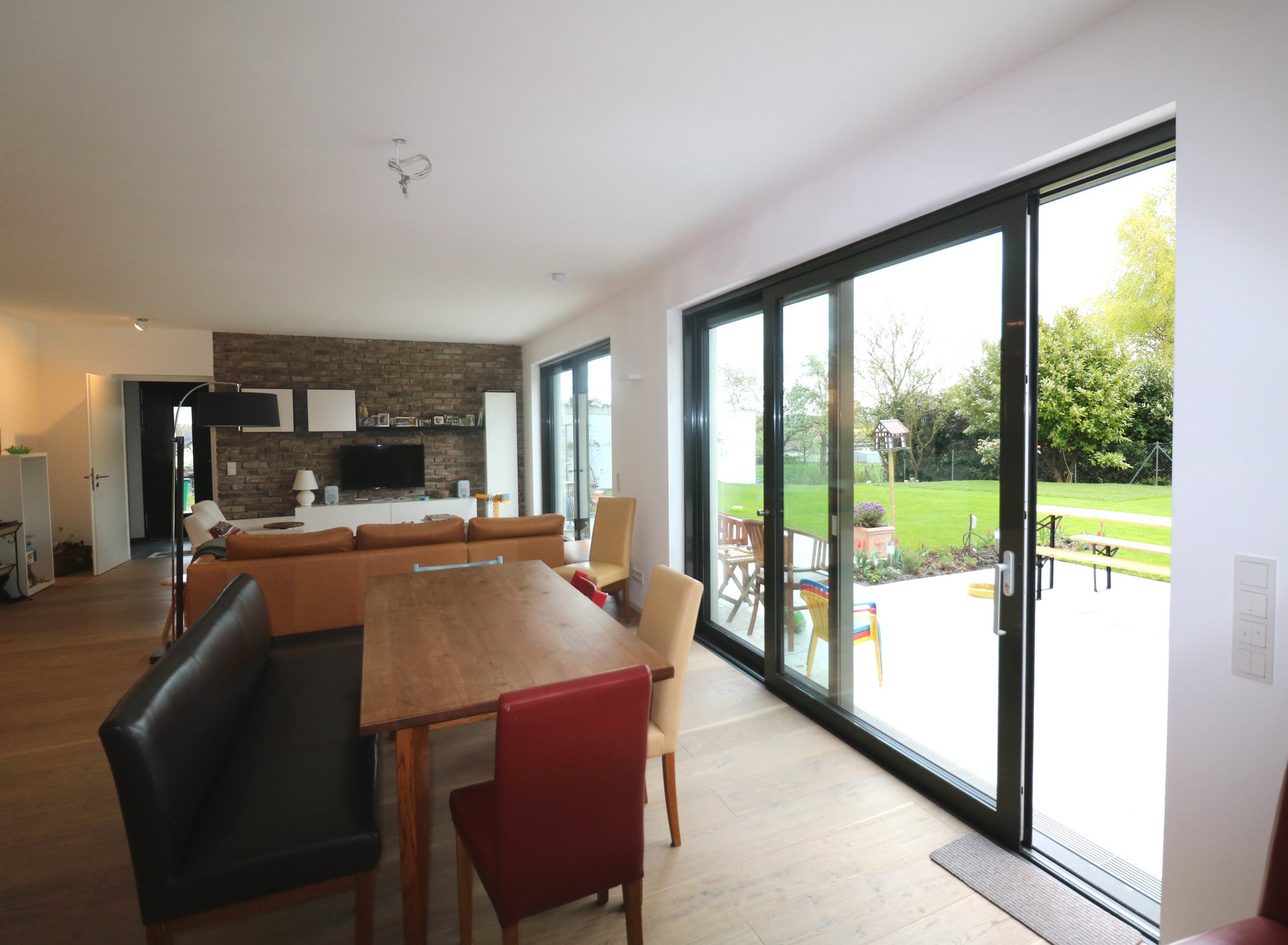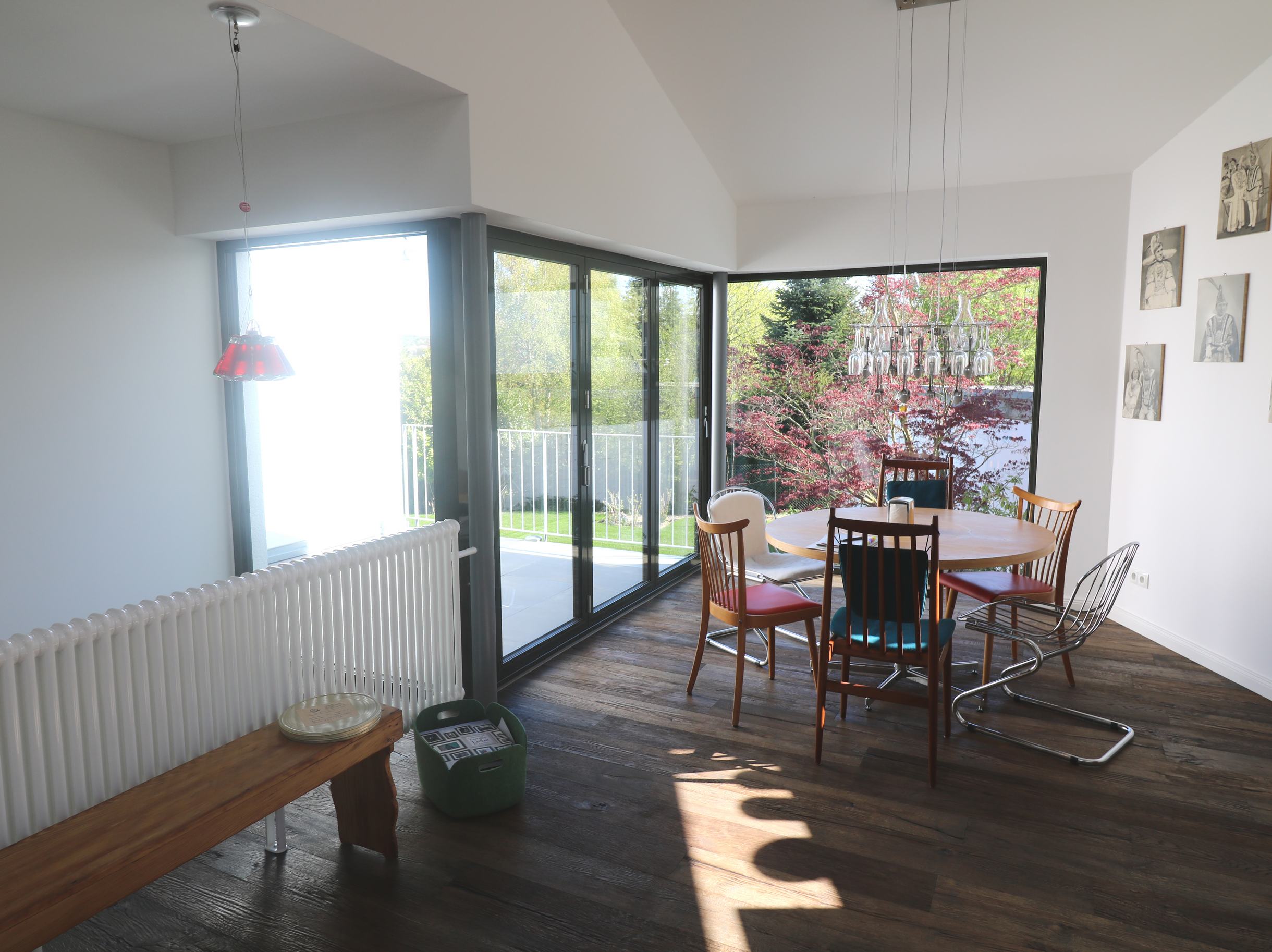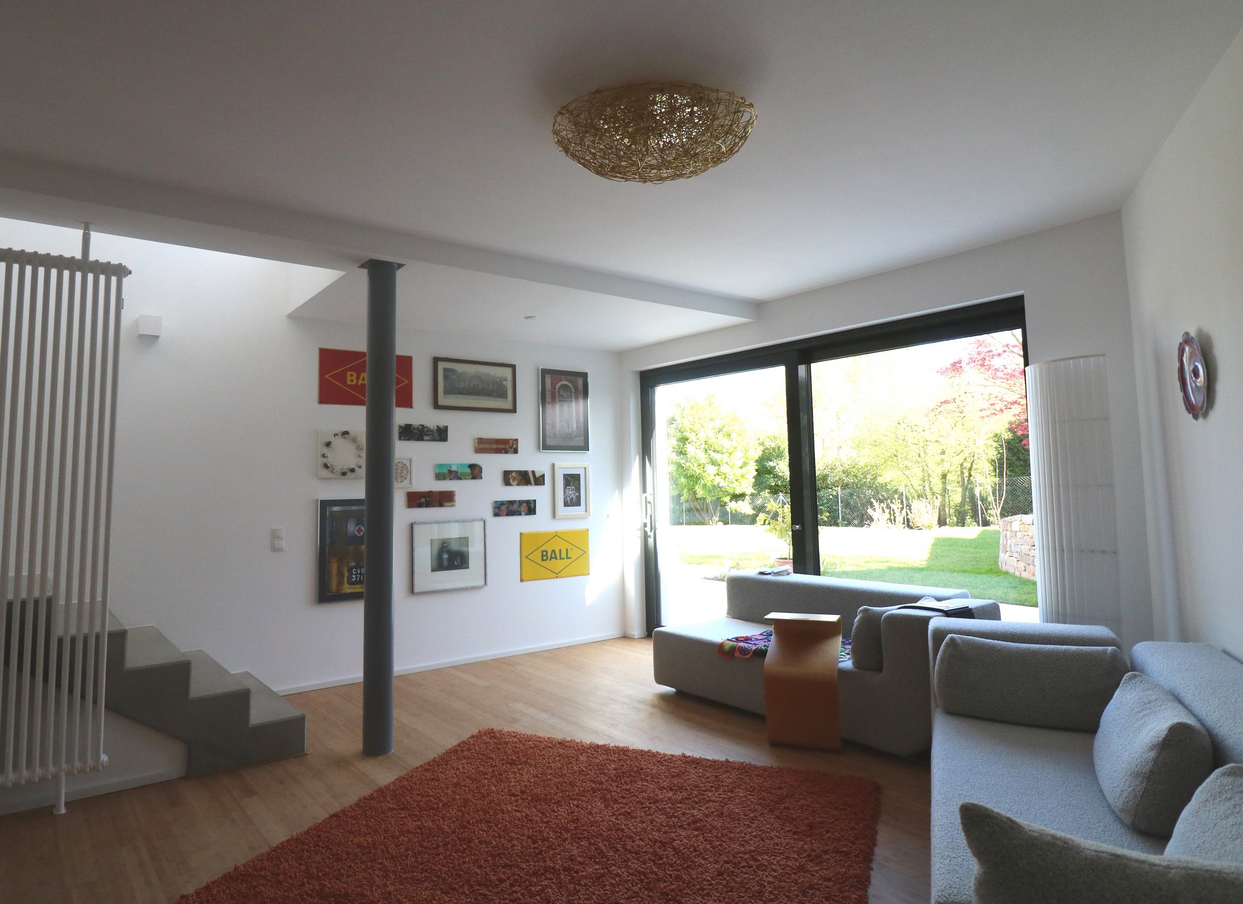 Damit sich dieses harmonisch in seine Umgebung einfügt und nicht als Fremdkörper wirkt, wurde das Satteldach des Hauses dort, wo sich die Eingänge in die beiden Einheiten befinden, durch ein Flachdach unterbrochen.