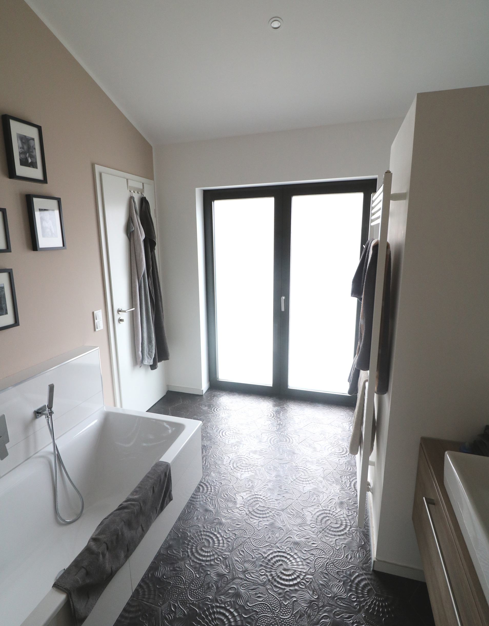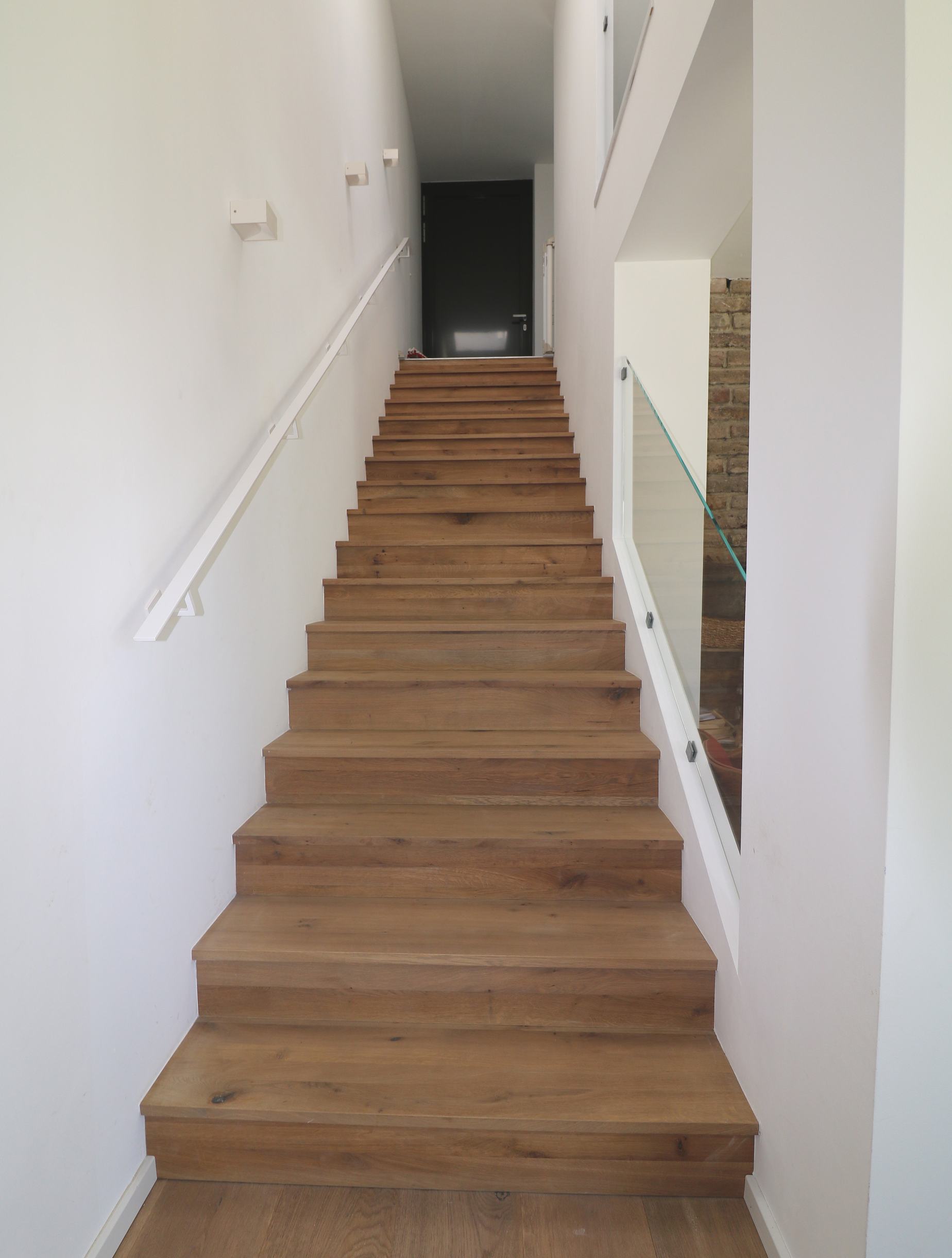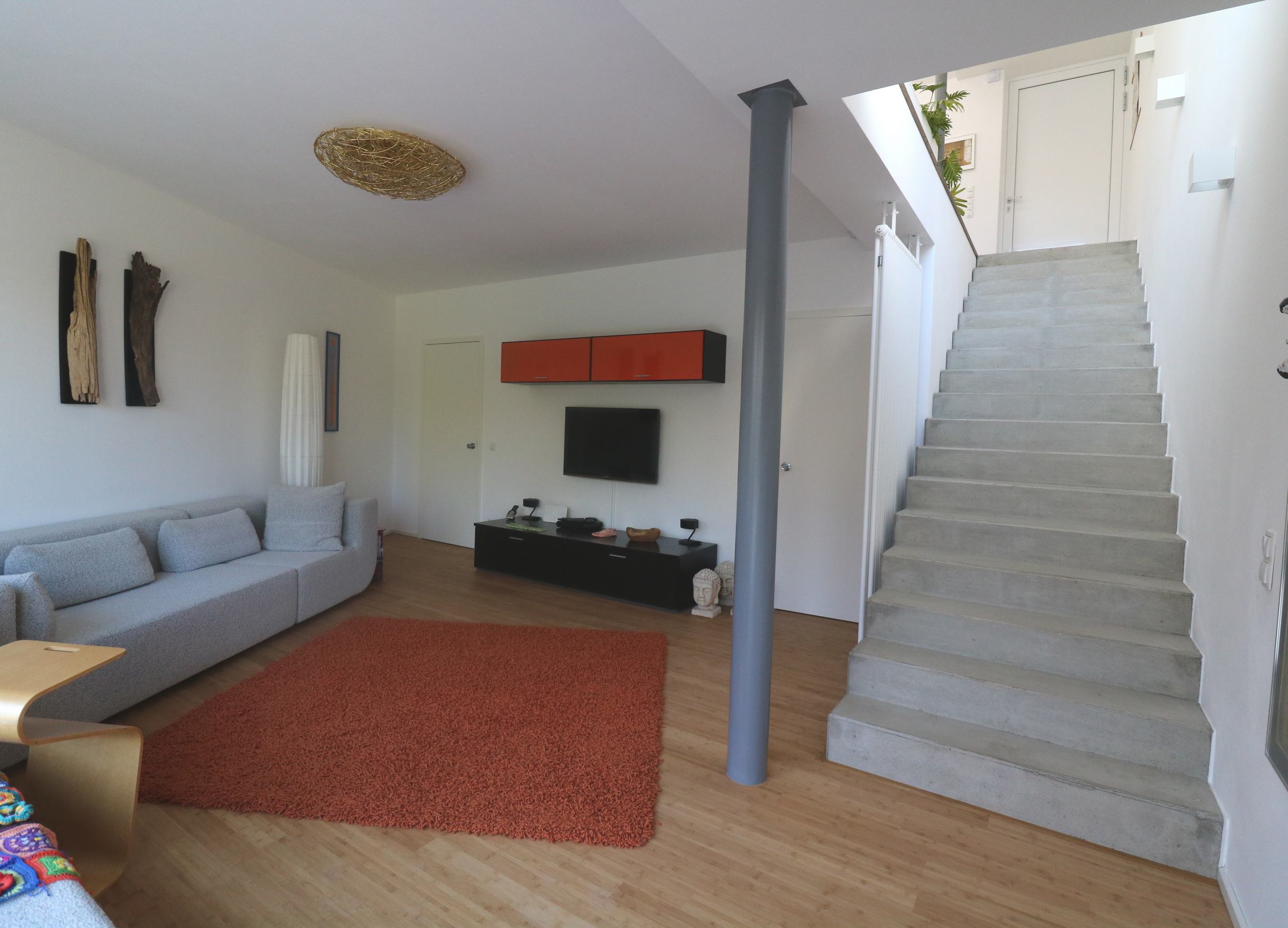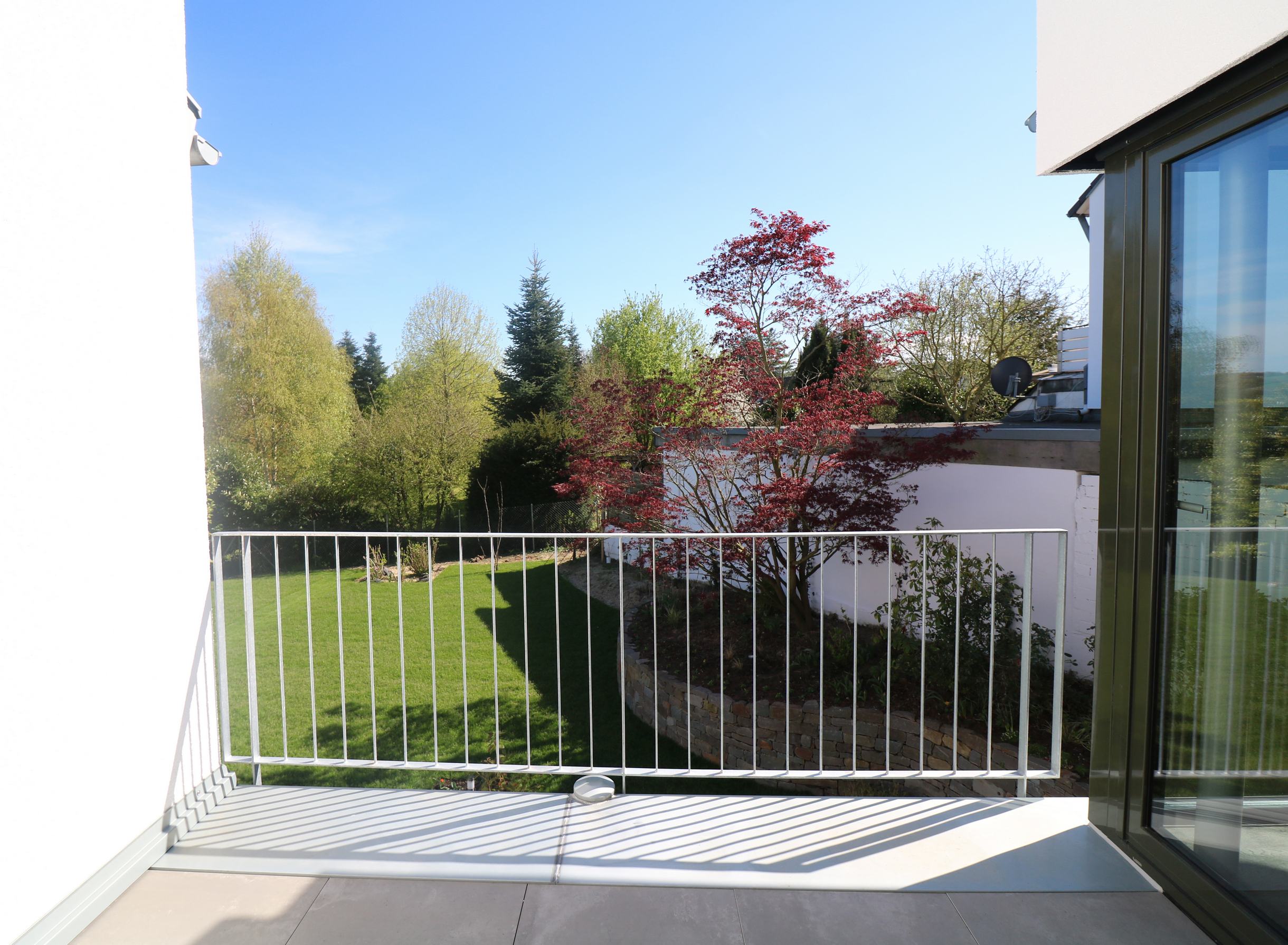 Damit sich dieses harmonisch in seine Umgebung einfügt und nicht als Fremdkörper wirkt, wurde das Satteldach des Hauses dort, wo sich die Eingänge in die beiden Einheiten befinden, durch ein Flachdach unterbrochen.